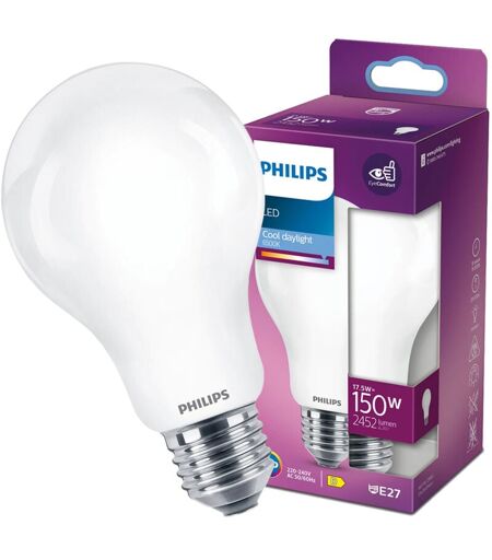 Ampoule Led Standard E27 17,5w 2452lm 6500k Lumière Froide. Taille: Ø7,5x12,1cm (diamètre/hauteur) 15000h. Ac 220-240v Classe Énergétique D Verre Mat, Non Gradable, Irc:80 Classe D. Angle D'ouverture 360°. Équivalence: 150w. Philips ...