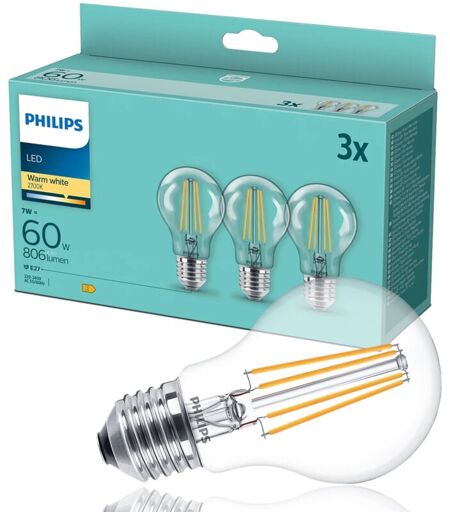 Lot de 3 ampoules LED à filament 7W A60 E27 2700K chaud CL ND3PFDisc Philips