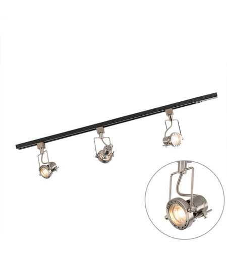 QAZQA Système sur rail avec 3 spots monophasé noir avec acier - Suplux Ce système sur rail avec trois spots sur rail industriels est un ajout précieux à votre intérieur! Avec leur caractère robuste et leur look industriel, ces spots sur rail s’intègrent parfaitement à la nouvelle tendance de décoration intérieure «Raw Urban». La lampe mesure 100cm de long et 20cm de haut, et les spots peuvent accueillir des ampoules GU10 (50W maximum), à commander séparément. Les spots sur rail sont également orientables et peuvent être utilisés avec un variateur externe (non inclus). Ces spots sont monophasés, ce qui signifie que toutes les sources lumineuses du rail sont commandées ensemble et sont donc toujours allumées ou éteintes en même temps. N’attendez plus et procurez-vous dès maintenant cette lampe robuste pour votre intérieur. Votre décoration sera alors vraiment complète! Type de culot: GU10. Max 3 x 50W, 230V. Convient pour: Halogène, LED. Tension: 220V/230V Indice de protection: IP20. ...