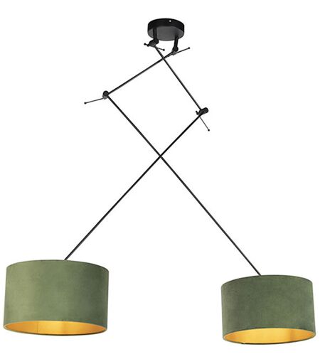 QAZQA Suspension noire avec abat-jour en velours vert et or 35 cm 2 lumières - Blitz Une forme robuste, un bel abat-jour! Voilà la suspension Blitz. La lampe a une hauteur totale de 150cm. La plaque de montage pour le plafond a un diamètre de 15cm. La lampe est finie avec deux abat-jour en velours de couleur verte, tous deux d’un diamètre de 35cm. Un bel ajout à ces abat-jour est l’intérieur doré, qui crée un bel effet d’éclairage! Elle trouvera parfaitement sa place dans votre chambre à coucher, votre salon ou votre couloir. Complétez votre suspension avec deux ampoules qui s’adaptent à un culot E27 (60W maximum chacune). La lampe peut également être atténuée avec un variateur externe; une ambiance encore plus cosy le soir avec la suspension Blitz. Avec cette suspension, vous optez pour un look romantique et robuste pour votre intérieur. Type de culot: E27. Max 2 x 60W, 230V. Convient pour: Incandescente, Halogène, LED, Economie d'énergie. Tension: 220V/230V Indice de protection: ...