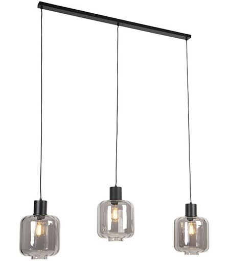QAZQA Suspension design noire avec verre fumé 3 lumières 161,5 cm - Qara Véritable accroche-regard design, cette Qara. La suspension est finie avec de l’acier et du verre fumé. Le verre fumé crée un effet ludique dans la pièce. La suspension mesure 140cm de long, 25cm de large et est réglable en hauteur. Hauteur minimale: 70cm, maximale: 161,5cm. Super pratique, car vous pouvez ainsi facilement déterminer la hauteur de votre lampe au-dessus de la table à manger ou en faire un accroche-regard dans le hall. La plaque de montage mesure 120cm de long, 6cm de large et 2,5cm de haut. Vous pouvez compléter votre Qara avec 3 ampoules, chacune avec un culot E27 (60W), celles-ci ne sont pas incluses. La lampe est fournie avec un cordon (121,5cm). Qara est dimmable avec un variateur externe, celui-ci n’est pas inclus. Ajoutez cette magnifique suspension à votre salon, votre bureau ou votre hall et apportez une touche de design à votre intérieur! Type de culot: E27. Max 3 x 60W, V. Convient pour: ...