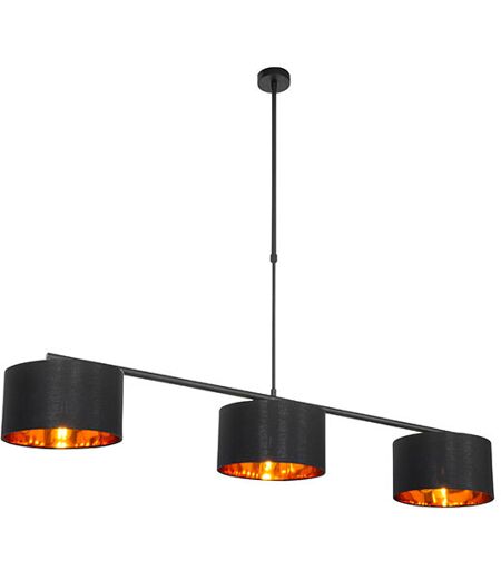 QAZQA Suspension moderne noire avec or 125 cm 3 lumières - VT 3 Vous recherchez une belle suspension moderne à placer au-dessus de votre table à manger? Ce modèle attire tous les regards et sera un véritable atout pour votre intérieur. Sa longueur est de 125cm et sa largeur de 25cm. La suspension est réglable en hauteur, de 76cm à 123cm maximum. Les abat-jour ont un diamètre de 25cm et une hauteur de 14cm. La lampe est réalisée en acier noir et possède des abat-jour en tissu noir avec un intérieur doré. Cela lui confère une lueur chaude supplémentaire lorsqu’elle est allumée. Un vrai cocon! N’oubliez pas d’acheter une ampoule adaptée. Vous aurez besoin d’ampoules avec un culot E27 (60W maximum). Vous pouvez également atténuer la lumière de la lampe avec un variateur externe (non inclus). Ajoutez une touche d’ambiance supplémentaire à votre table à manger avec cette suspension moderne! Type de culot: E27. Max 3 x 60W, 230V. Convient pour: Incandescente, Halogène, LED, Economie ...