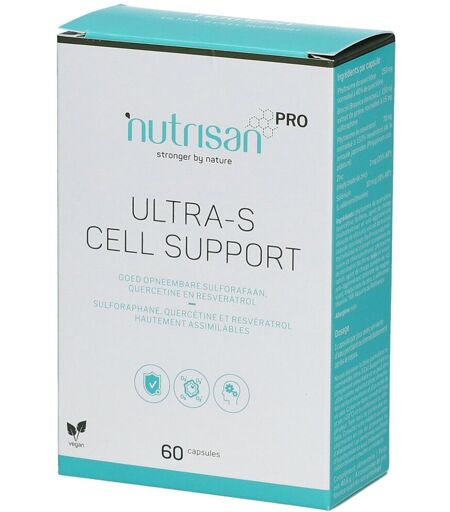 Complément alimentaire à utiliser dans le cadre d’une alimentation variée, équilibrée et d’un mode de vie sain.Sulforaphane, quercétine et resvératrol hautement absorbablesUltra-S Cell Support est une combinaison unique et innovante de sulforaphane, de quercétine et de resvératrol, dont chacun a été soigneusement sélectionné pour assurer une stabilité et une absorption optimales par l'organisme.Pourquoi choisir Ultra-S Cell Support ?Biodisponibilité supérieure- Sulforaphane hautement stable avec une biodisponibilité 7 fois supérieure à celle du sulforaphane dérivé de l'extrait de glucoraphanine.- 250 mg de phytosome de quercétine sont 10 fois plus biodisponibles que 500 mg de quercétine ordinaire.- Le phytosome de resvératrol est 14 fois plus absorbable que le resvératrol libre.Formule innovante : largement applicable.Recherches scientifiques approfondies et étendues.Unique sur le marchéCette formule est également complétée par du sélénium et du zinc facilement absorbablesBénéficesLe sélénium et le zinc contribuent au fonctionnement normal du système immunitaire.Le zinc joue un rôle dans le processus de division cellulaire et contribue à la synthèse normale de l'ADN.Le sélénium et le zinc contribuent à la protection des cellules contre le stress oxydatif.Le zinc contribue à une fonction cognitive normale.IngrédientsPhytosome de quercétine (quercétine, lécithine, charge (maltodextrine) et agent anti-agglomérant (dioxyde de silicium)), extrait de brocoli, gélule (enrobage (hydroxypropylméthylcellulose) et colorant (complexes cuivreux de chlorophyllines), phytosome de resvératrol (lécithine (SOJA) et resvératrol), charge (amidon de riz), agent anti-agglomérant (stéarate de magnésium), bisglycinate de zinc, méthionine de L-sélénium.Allergènes : Soja.Valeurs nutritionnelles Pour 1 GélulePhytosome de quercétineStandardisé à 40% de quercétine250 mgExtrait de graines de brocoli (Brassica oleracea L.)Standardisé à ≥5 mg de sulforaphane150 mgPhytosome de resvératrolstandardisé à ≥33% resvératrol (de la renouée du Japon (Polygonum cuspidatum))70 mgZinc (bisglycinate de zinc)2 mg (20% AR*)Sélénium (L-sélénium méthionine)10 mcg (18% AR*)Conseils d'utilisationPrendre 1 capsule par jour pendant ou immédiatement après le repas avec un verre d'eau.Précautions d'emploiUn complément alimentaire ne se substitue pas à un régime alimentaire varié et équilibré ou à un mode de vie sain.Conserver dans un endroit frais et sec et de préférence au réfrigérateur.Tenir hors de portée des enfants.Ne pas dépasser la dose recommandée.Consultez votre médecin avant de l'utiliser si vous êtes enceinte ou si vous allaitez.Les personnes souffrant d'hypothyroïdie ou sous traitement thyroïdien doivent consulter un médecin.Poids net60 gélulesAdresse du FabricantNutrisanOude Molenstraat 949100 Sint-NiklaasBelgique ...