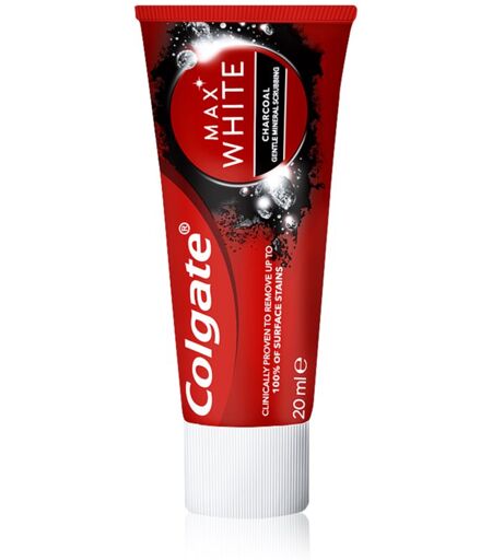 Colgate Max White Charcoal, 20 ml, Dentifrices blanchissants mixte, Le dentifriceColgate Max White Charcoal est conçu pour délicatement blanchir vos dents. Son utilisation régulière supprime efficacement la pigmentation dentaire, elle vous rend votre sourire radieux. Le produit : blanchit les dents lutte contre la carie dentaire et le tartre dentaire Mode d’emploi : Utilisez au moins 2 fois par jour. Nettoyez vos dents minutieusement pendant au moins 2 minutes. ...