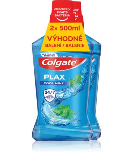 Colgate Plax Cool Mint, 2x500 ml, Bains de bouche mixte, Le bain de bouche Colgate Plax Cool Mint ne vous aide pas uniquement à rafraichir votre haleine, il agit également contre la plaque dentaire et aide à maintenir une bonne hygiène de la gencive et des dents. Le produit : tue les bactéries assure une haleine fraîche protection contre la plaque dentaire Mode d’emploi : Après le brossage des dents, rincez la bouche avec le bain de bouche pendant la durée indiquée sur l’emballage, rincez ensuite. ...
