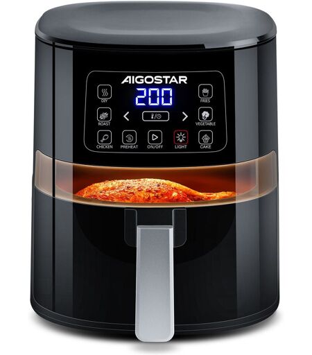 Aigostar Maha - Friteuse à air 0% BPA de 4L. 5 fonctions préprogrammées + préchauffage¿ 1600W¿ fenêtre de visualisation¿ éclairage intérieur indépendant. Panneau tactile LED¿ mode manuel