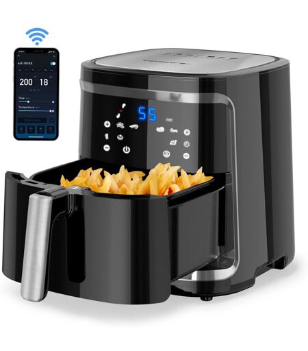 ¿Connexion Wifi¿La friteuse à air Smart Cube vous offre une expérience de cuisson totalement inédite. Vous pourrez contrôler la friteuse depuis votre mobile, il vous suffit de la connecter via Wi-Fi à l'application AigoSmart pour avoir accès à ses nombreuses fonctions et facilité d'utilisation.¿Des aliments plus sains¿La friteuse à air Aigostar Cube est 4 fois plus rapide qu'un four conventionnel. Son chauffage interne par circulation d'air à 360° à haute vitesse cuit sans huiles ajoutées, les aliments sont donc moins caloriques et plus sains. Réduisez votre consommation de matières grasses jusqu'à 85% en évitant les friteuses à huile traditionnelles.¿Grande capacité et utilisation polyvalente¿ L¿appareil a une capacité de 7 litres pour cuire de 6 à 10 portions. De plus, il permet une cuisson traditionnelle dans le panier ou une cuisson directe dans le tiroir en effectuant un petit réglage sur la poignée.¿Facile à utiliser¿La friteuse dispose de 7 fonctions préprogrammées: pommes de terre, crevettes, poulet, b?uf, viande, poisson, gâteau et maintien au chaud. Son utilisation est très simple, il vous suffit de sélectionner la fonction que vous souhaitez utiliser sur votre écran LED ou si vous préférez faire un réglage manuel, il suffit de régler la température de 80°C à 200°C et la durée de 0 à 60 min. Il comprend également 20 recettes pdf pour vous fournir des idées supplémentaires.¿Fonctionnel¿ La friteuse est complètement sans BPA, le panier est amovible et facile à nettoyer. L¿appareil possède également des pieds antidérapants, un trou de rangement du câble, une poignée toujours froide et une fonction de maintien au chaud. De plus, en la connectant à l'application AigoSmart, vous aurez des fonctions supplémentaires telles que l'ajout d'un menu et son enregistrement pour une utilisation future ou un rappel pour faire pivoter le panier pendant la cuisson. ...