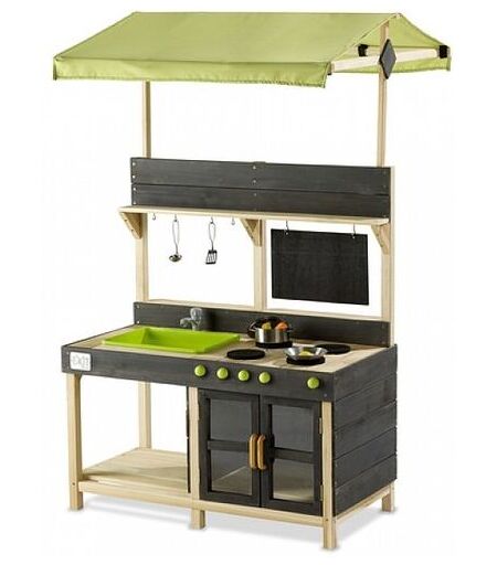 La cuisine de plein air en bois EXIT Yummy 300 est une cuisine de jeu multifonctionnelle pour les enfants âgés de 2 à 5 ans. Avec son toit vert et son tableau noir, cette cuisine de jeu entièrement équipée est unique. La cuisine de plein air est équipée d'une cuisinière avec four à boutons rotatifs et d'un robinet qui fonctionne réellement. Le robinet fonctionne lorsque vous raccordez le tuyau d'arrosage et, grâce à l'évier amovible, l'eau du robinet est facile à vider de l'évier. En outre, l'EXIT Yummy 300 dispose de nombreux espaces de rangement pour les casseroles et autres accessoires de cuisine. Les autres ustensiles sont suspendus aux crochets.. . Mais l'EXIT Yummy 300 est plus qu'une cuisine. Avec son toit vert et son tableau, la cuisine de plein air fait figure d'étal de marché. Ainsi, la Yummy 300 n'est pas seulement une cuisine, mais également un lieu de partage et de vente de plats faits maison.. . Les cuisines de plein air signées EXIT Toys sont fab ... ...