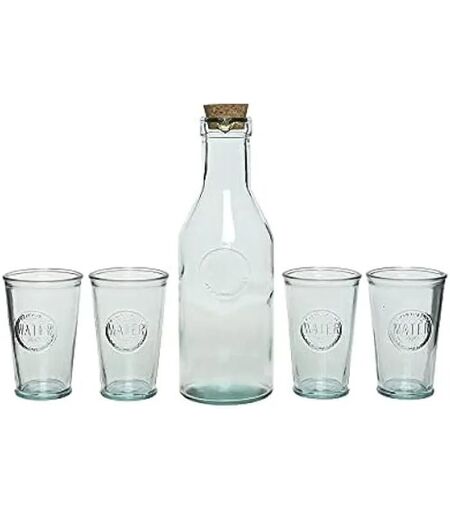 Découvrez ce joli set de boissons comprenant une bouteille en verre recyclé de 31 cm avec un bouchon en liège et 4 verres transparents. Idéal pour les adultes, ce lot de 5 est compatible avec le lave-vaisselle, alliant esthétique et praticité. ...