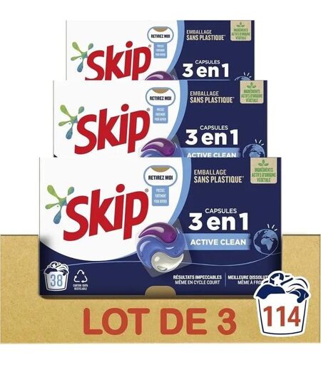 SKIP - Lessive liquide en capsules Active Clean 3 en 1 - 114 lavages - fraîcheur longue durée - sans emballage plastique (lot 3x38)