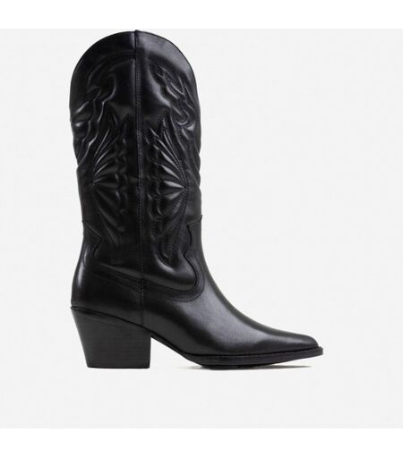 This black Western boots offers a sleek take on a timeless silhouette. Designed with a pointed toe cap and a sturdy block heel, it provides both style and stability for everyday wear. The rounded-off collar adds a subtle softness to the bold design, creating a flattering shape that pairs effortlessly with a range of outfits. Whether styled with denim or dresses, this boot brings a confident, modern edge to any look. Tige - 100% Cuir, Doublure. et Chaussette - 100% Cuir. Semelle - 100% Caoutchouc ...
