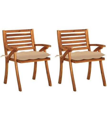 Asseyez-vous pour un dîner en plein air ou détendez-vous et profitez du beau temps avec ces chaises de salle à manger en bois d'acacia massif. Ces chaises de salle à manger sont en bois d¿acacia massif, ce qui les rend solides et stables. Le coussin ajoute un confort supplémentaire lors des repas. Chaque coussin dispose de 2 ensembles de cordes afin que vous puissiez le fixer fermement sur la chaise en bois. Couleur des coussins : beige Matériau de la chaise : bois d'acacia massif avec finition à l'huile Matériau du coussin : tissu (100 % polyester) Dimensions totales de la chaise : 59 x 59 x 87 cm (l x P x H) Dimensions du coussin : 50 x 50 x 7 cm (l x P x é) L'assemblage est requis La livraison contient : 2 x chaise de salle à manger 2 x coussin Maximum 110 kg par siège. ...