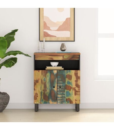 Ce buffet classique, au look intemporel, est conçu pour être un excellent supplément à votre maison. Bois de récupération solide : le bois de récupération solide se compose de bois réutilisés tels que du teck, du bois de manguier, du pin et du hêtre. Ces matériaux sont recyclés à partir d'anciens bâtiments tels que des usines, des hangars et des bateaux. Comme chaque pièce est faite à la main, les couleurs varient pour chaque produit.Rangement spacieux : ce buffet offre un grand espace de rangement pour garder vos articles essentiels organisés et à portée de main.Dessus de table robuste : le dessus de l'armoire offre une surface sécurisée pour placer des collations, des boissons, des vases, des bols de fruits ou d'autres articles décoratifs.Pieds en fer : les pieds en fer de ce meuble de chambre à coucher garantissent robustesse et stabilité. Bon à savoir :Les couleurs peuvent varier d'une pièce à l'autre, rendant chaque pièce unique et légèrement différente l'une de l'autre. La livraison est aléatoire, ce qui garantit l'exclusivité et l'individualité de votre produit. Attention :Pour éviter qu'il ne soit renversé, ce produit doit être utilisé avec le dispositif de fixation au mur fourni. Matériau : bois de récupération solide avec une finition de couleur mélangée, fer Dimensions : 60 x 33 x 75 cm (L x l x H) L'assemblage est requis Legal Documents: Vous trouverez ...