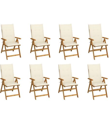 Cet ensemble de chaises de jardin en bois est conçu pour ajouter un look vintage à tout dîner dans votre jardin, sur votre terrasse ou patio. La chaise pliable est fabriquée en bois d¿acacia massif, un bois dur tropical, ce qui la rend stable et durable. La surface à finition à l'huile est facile à nettoyer avec un chiffon humide. La chaise de salle à manger peut être réglée à 5 positions, vous offrant un confort d¿assise optimal. Elle peut également être pliée pour économiser de l¿espace lorsqu'elle n¿est pas utilisée. Les coussins inclus offrent un confort supplémentaire. Remarque : afin de prolonger la durée de vie de vos meubles d'extérieur, nous vous recommandons de les nettoyer régulièrement et de ne pas les laisser à l'extérieur sans protection inutilement.Nettoyage : utiliser une solution savonneuse douceStockage : si possible, stockez dans un endroit frais et sec à l'intérieur. Si le produit est stocké à l'extérieur, protégez-le avec une housse imperméable. Essuyez et séchez l'excès d'eau ou de neige des surfaces planes après la pluie ou une chute de neige. Permettez une circulation d'air suffisante afin d'éviter les dommages liés à l'humidité. Couleur du coussin : Crème Matériau de la chaise : bois d'acacia massif avec finition à l'huile Matériau du coussin : tissu (100 % polyester) Dimensions de la chaise : 57 x 69 x 111 cm (l x P x H) Dimensions du coussin : 120 x 50 x 3 cm (L x l x é) Pliable pour un rangement et un transport facile Le coussin comprend une sangle élastique et 2 jeux de cordes L'assemblage est requis La livraison contient : 8 x chaise de jardin 8 x coussin Maximum 110 kg par siège. ...