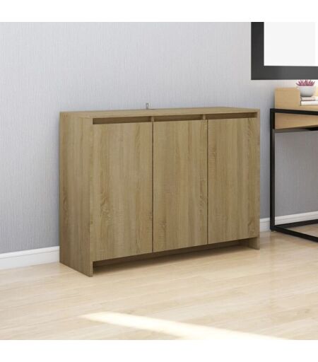Ce buffet constitue un supplément décoratif et pratique parfait à votre décoration existante. Cette armoire latérale présente une construction solide et durable. Avec ses 3 portes, l'armoire offre un vaste espace de rangement pour les livres, les appareils multimédia et d'autres articles. Le dessus de table robuste est idéal pour afficher des objets décoratifs, des cadres photo ou des plantes en pot. Couleur : chêne sonoma Matériau : aggloméré Dimensions : 102 x 33 x 75 cm (L x l x H) L'assemblage est requis ...