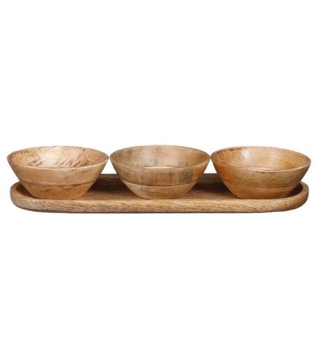 Issus de la collection Mica Decorations, les bols de service Tomar avec plateau sont parfaits pour présenter de savoureux en-cas. Ces plateaux sont fabriqués à 100 % en bois de manguier naturel certifié FSC, d'une belle teinte brun clair. Ils sont vendus en set, composé de trois petits bols et d'un plateau ovale. Idéal pour servir des tapas ! Les dimensions sont L35 x L12 x H5 cm. ...