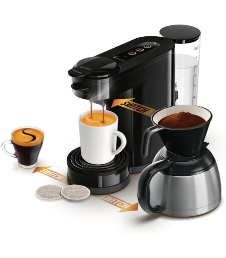 Philips HD6594/62. Type de produit: Machine à café 2-en-1, Type de cafetière: Semi-automatique, Capacité du réservoir d'eau: 1 L, Type d'entrée à café: Dosette de café, Café moulu, Réservoir de café: Tasse, Carafe, Capacité en tasses: 7 tasses. Puissance: 1450 W. Couleur du produit: Noir ...