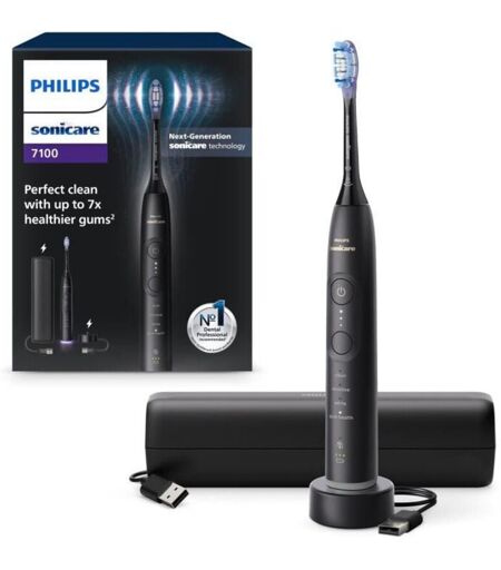 Philips Sonicare Serie 7100 Noir : 4 mode - 3 intensites - Technologie BrushSync - 1 tete de brosse Premium Gum Care G3 - Smartimer + QuadPacer - Capteur de pression (visuel) - Autonomie 3 semaines - Connectivite Bluetooth - Etui de voyage USB ...