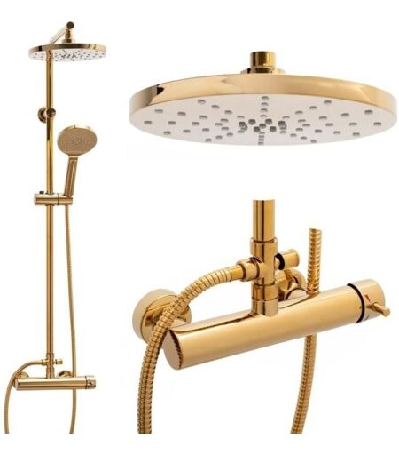 Design moderne et unique et exécution de la plus haute qualité. Les matériaux non corrosifs garantissent la durabilité et la fiabilité à long terme de nos produits. Voici un ensemble de douche extrêmement élégant. L'ensemble contient un mitigeur de douche mécanique avec contrôle de débit, ainsi qu'une colonne de douche avec une fine douche à effet pluie. Il a un diamètre de 23 cm et un interrupteur à jet de pression. La pomme de douche, quant à elle, est équipée de deux réglages de jet d'eau qui peuvent être réglés par un interrupteur sur la poignée. La tête en céramique du robinet (35 mm) garantit durabilité et résistance. La douche à effet pluie et la douchette sont équipées du dernier système ANTI-CALC intégré. Le design de l'ensemble suit les dernières tendances et la couleur dorée en fera un bijou dans votre salle de bain. Le kit contient : Robinet - corps en laiton avec tête en céramique poteau de construction en acier inoxydable Pommeau de douche mural ANTI-KALC TECHNOLOGY avec ...