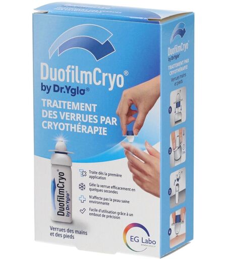 DuofilmCryo est recommandé pour le traitement par cryothérapie des verrues des mains et des pieds. DuofilmCryo est rapide, efficace et précis : - Il traite la verrue dès la première application- Il gèle la verrue en quelques secondes- Il détient un applicateur spécial avec un embout de précision qui permet de cibler uniquement la verrue, et de ne pas affecter la peau saine environnante. Prêt à l'emploi. IndicationAdulte et enfant à partir de 4 ans.Mode d'emploiComment utiliser DuofilmCryo? 1. Placer l’aérosol sur une surface dure.- Se laver les mains (hormis la zone traitée) immédiatement après utilisation.2. Placer l’applicateur sur l’aérosol, l'embout métallique vers le haut. Ne pas appuyer sur l’applicateur avant d’être prêt à appliquer le froid.3. Appuyer sur l’applicateur blanc pendant 3 secondes. Laisser ensuite reposer l’aérosol pendant 5 secondes.Prendre garde à ne pas toucher l'embout métallique en appuyant sur l'applicateur. Ne pas dépasser 3 secondes.4. Retirer l’applicateur de l’aérosol en maintenant l’embout métallique vers le haut, pour une application précise sur la verrue. 5. Appliquer l’embout métallique sur la verrue commune pendant 20 secondes ou sur la verrue plantaire pendant 40 secondes. Veiller à ce que l’embout métallique couvre autant que possible la surface de la verrue.Si la verrue n'a pas disparu ou pas complètement disparu 14 jours après le traitement, le traitement peut-être répété en toute sécurité.Si le dispositif est utilisé par plusieurs personnes et/ou après chaque utilisation, nettoyer l'applicateur avec un chiffon imbibé d'alcool.Précautions d'emploiTenir hors de la vue et de la portée des enfants.Récipient sous pression :peut exploser en cas d'exposition à la chaleur.Ne pas percer ni brûler, même après utilisation.Tenir éloigné de la chaleur/des étincelles/des flammes/des surfaces chaudes - Ne pas fumer.Ne pas pulvériser sur une flamme découverte ou sur une autre source d'ignition. Ne pas exposer à des températures dépassant 50°C. Tenir à l'abri de la lumière du soleil. Toujours lire la notice incluse dans la boîte avant d'utiliser le produit. ...