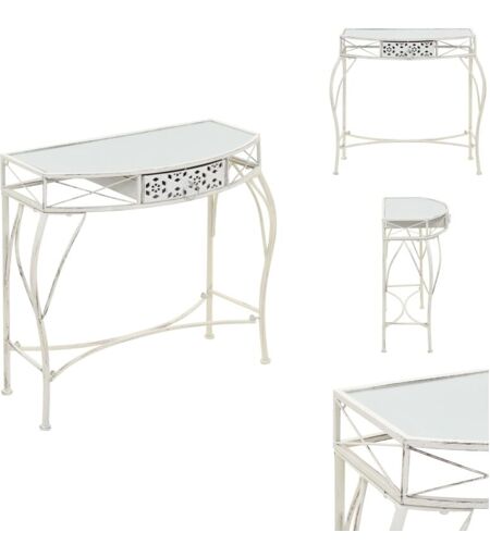 VidaXL Table d'appoint Style français Métal 82 x 39 x 76 cm Blanc Notre table d'appoint en style français est un choix idéal pour présenter vos plantes en pot, vases ou d'autres objets décoratifs. Elle ajoutera une touche pratique ainsi que décorative à votre décoration intérieure grâce à son design saisissant. La table est faite d'un cadre en métal et d'un dessus de table en verre, stable et facile à nettoyer. La table d'appoint a un tiroir qui est orné de détails exquis, ce qui donne à la table un aspect antique et crée un air d'élégance dans votre maison. L'article est facile à assembler. Attention : pour éviter qu'il ne soit renversé, ce produit doit être utilisé avec le dispositif de fixation au mur fourni. Vos avantages Dieser Beistelltisch im französischen Stil aus Metall verfügt über eine mit feinen Details verzierte Schublade, die dem Tisch einen antiken Look verleiht und ihn in jedem Raum zu einem Blickfang macht. Autres spécifications Couleur : Blanc Matériau : métal, verre ...