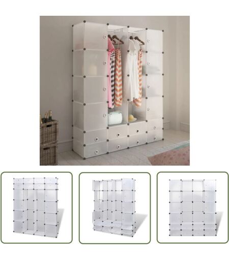 The Living Store Cabinet modulable avec 18 compartiments blanc 37x146x180,5 cm Cette armoire modulaire fonctionnelle est non seulement très élégante, mais gardera vos vêtements et chaussures bien organisés. Elle s'intégrera parfaitement dans votre chambre d'enfant, votre salon, votre couloir ou votre chambre à coucher. L'armoire est composée d'éléments en plastique et de fils d'acier chromé, ce qui la rend facile à nettoyer. Grâce à sa conception astucieuse, l'armoire peut être installée rapidement et facilement dans différentes configurations, en fonction de l'espace ou de votre humeur. Évitez de trop solliciter les étagères et notez que le plastique est inflammable. Vos avantages Ce cabinet modulable esthétique et multifonctionnel est votre premier choix pour y stocker vos vêtements, chaussures et d’autres affaires. Autres spécifications Couleur : Blanc Dimensions: 37 x 146 x 180,5 cm Matériau : plastique 18 compartiments: 16 compartiments fermés + 2 compartiments suspendus ouverts ...