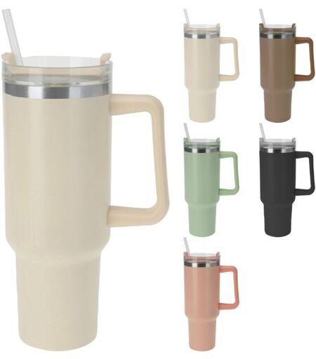 Tasse thermo de voyage 1200 ml + paille en plastique. fabriqué en aluminium double couche, couvercle à vis en plastique transparent avec languette rotative pour ouvrir et fermer ; maintient la température du contenu. hauteur 26 cm, diamètre du fond 7,5 cm (diamètre de la canette souple); 5 couleurs variées (gris foncé, gris clair, rose pastel, vert menthe et crème) ...