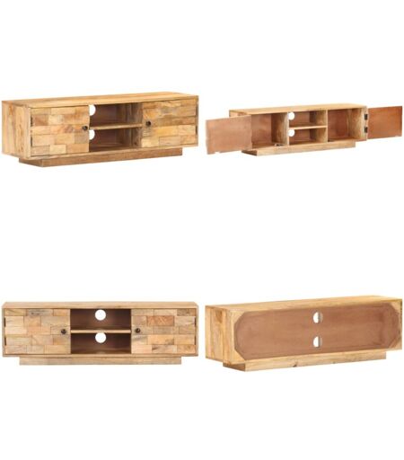Meuble TV 116x30x35 cm Bois de manguier solide Ce meuble TV en bois présente un style classique et en fait un choix parfait pour votre espace de vie intérieur. Le meuble stéréo est fait de bois massif de manguier avec une finition en bois naturel, un bois dur tropical avec la force de soutenir le poids. Il résiste également à l’usure du temps, ce qui le rend stable et durable. Le savoir-faire et les belles veines du bois rendent chaque meuble unique et légèrement différent l'un de l'autre. L’unité multimédia est également dotée de deux portes et de deux étagères offrant un vaste espace de rangement. Le dessus robuste peut être utilisé pour afficher des objets décoratifs tels que des cadres photo, des plantes en pot, des vases, etc. Remarque importante : les couleurs et les grains varient d'une pièce à l'autre, rendant chaque pièce unique. La livraison est aléatoire, ce qui garantit l'exclusivité et l'individualité de votre produit. Vos avantages Ce meuble TV en bois est fabriqué en ...