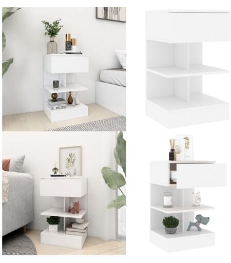 Table de chevet Blanc 40x35x65 cm Bois d’ingénierie Cette table de chevet dégage une touche de charme moderne et constitue un excellent supplément à la décoration actuelle de votre pièce. La construction robuste de la table de chevet la rend très durable. Passez une belle après-midi avec un livre, ou placez la table à côté de votre lit pour ranger masques de beauté et petits accessoires à portée de main. Cette table multifonctionnelle s'adapte parfaitement à votre besoin ! Vos avantages Introduisez un air de charme dans le décor actuel de votre pièce avec cette table de chevet élégante ! Autres spécifications Couleur : Blanc Matériau : bois d'ingénierie Dimensions : 40 x 35 x 65 cm (l x P x H) L'assemblage est requis ATTENTION: afin d'éviter qu'il ne bascule, ce produit doit être utilisé avec le dispositif de fixation murale fourni. Vous trouverez ici plus de détails sur la façon d'empêcher vos meubles de basculer Contenu du colis Table de chevet Blanc 40x35x65 cm Bois d’ingénierie ...