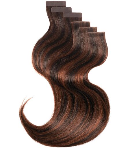 Avec les cheveux intégrés dans la bande, il offre une finition sans couture, presque invisible. L'ensemble dispose d'une partie supérieure invisible et d'une partie inférieure normale, ce qui permet de conserver le volume et d'intégrer les cheveux sans couture. En plus de la longueur de 40 cm, il est désormais possible de créer de la longueur et du volume avec une intégration invisible pour les clients qui souhaitent des cheveux ultra longs. Chaque paquet contient un set de 6 extensions de bande : 3 bandes régulières et 3 bandes enrichies en cheveux. Easy Invisible Tape Extensions 55 cm / 22", largeur 4 cmTechnique d'application : TapeType de cheveux : cheveux humainsIntégration quasiment invisibleExtensions abordables pour les cheveux finsPeut être combinée avec d'autres extensions (tape) La méthode Easy Invisible Tape est parfaite pour les cheveux fins, lorsqu'une extension de cheveux discrète est souhaitée. La fusion des cheveux et du tape permet d'obtenir une finition presque invisible. Les Easy Invisible Tapes sont conçus pour s'intégrer parfaitement dans les cheveux - avec un tape invisible pour une intégration naturelle et un tape standard. Optez pour les extensions Easy Invisible Tape pour obtenir un look subtil et impeccable avec un volume naturel. Un système dans lequel des bandes normales sont fixées sous l'Invisible Tape rend ce nouveau produit abordable. La combinaison avec d'autres produits (tape) vous donne la flexibilité dont vous avez besoin pour créer de superbes looks. Coiffez vos cheveux comme de vrais cheveux - les extensions Easy Invisible Tape peuvent être bouclées, lissées et coiffées de la même manière que vos propres cheveux. Application Easy Invisible Tape Extensions (4-6 semaines) : 1. retirer le film de protection des bandes. 2. faire une raie et séparer les cheveux d'une section d'environ 4 cm. Tenir un ruban adhésif normal en dessous et placer les cheveux naturels par-dessus. Appuyer fermement sur les cheveux naturels pour qu'une quantité suffisante de cheveux adhère au tape. 3. placer un Easy Invisible Tape sur la section et presser fermement. 4. si nécessaire, utiliser un fer à lisser pour fixer plus fermement le tape. 5. ne pas laver les cheveux pendant 24 heures afin de garantir une tenue parfaite. Réutilisation des tapes Pour réutiliser les extensions Easy Invisible Tape, il faut utiliser Tape On Roll. Pour retirer les anciennes extensions Tape des cheveux naturels, il est possible d'utiliser le Silk Tape Remover non chimique. Si le Silk Tape Remover est utilisé, il est important de bien laver les extensions et les cheveux naturels avant de les appliquer à nouveau, afin de s'assurer que toutes les huiles ont été éliminées. ...
