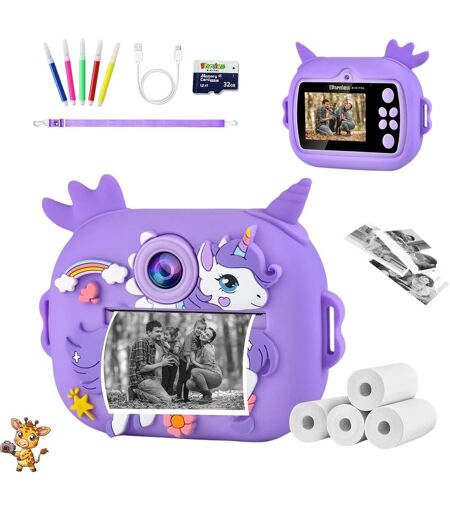 [ APPAREIL PHOTO PREMIUM 48MP & IMPRESSION INSTANTANÉE] Écran prémium HD 2.4 pouces pour une visibilité parfaite et une utilisation facile et intuitive Qualité photo professionnelle 48MP et vidéo Full HD 1080P Zoom numérique X8 et autofocus pour des photos parfaites. Pr de photos en mode Selfie grâce aux 2 objectifs Impression instantanée thermique vos souvenirs, zéro encre évitant le temps de séchage [ PLUS QU'UN APPAREIL PHOTO L'outil créatif et ludique idéal pour les enfants] Apprenez en vous amusant avec 4 jeux exclusifs conçus pour stimuler l'esprit des enfants Laissez libre cours à l'imagination de vos enfants avec les 18 filtres amusants pour personnal r leurs photos Développez la créatiivté en coloriant les photos avec les crayons de couleurs inclus Ecoutez vos musiques préférées avec le lecteur MP3 intégré Choisissez entre une Licorne violette féérique ou un Dinosaure vert rigolo ! [ KIT COMPLET NOUVELLE GÉNÉRATION INCLUANT] 1 Appareil photo numérique avec design ergonomique adapté aux enfants 1 Housse silicone pour une protection complète 4 rouleaux de papier photo pour une utilisation immédiate 1 Carte mémoire SD 32GB, extensible à 64GB, pour stocker des milliers de photos 1 câble USB type C pour une recharge rapide 1 Dragonne de sécurité [ AUTONOMIE EXCEPTIONNELLE] Batterie longue durée de 1100mAh Jusqu'à 4 heures de pr de photos Jusqu'à 2 heures d'enregistrement vidéo Chargement rapide via USB Type-C [ SÉCURITÉ & QUALITÉ PREMIUM] Matériaux ABS + Silicone de qualité supérieure certifiés sans danger pour les enfants Certifié sans produits toxiques Design ergonomique adapté aux enfants Protection antichoc avec coque silicone incluse Garantie 1 an et support client 7j/7 réactif et professionnel en francais ¿¿ ...
