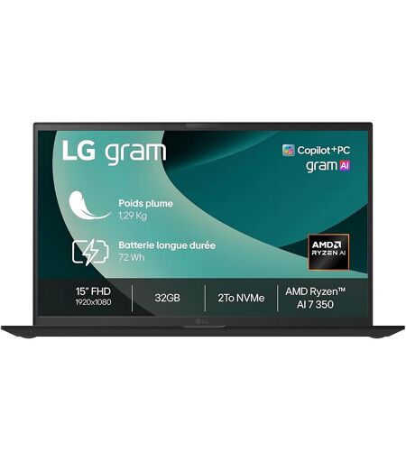 PC portable LG Gram 15 15Z80T-G.AU8BF 15" Copilot+ AMD Ryzen AI 7 32 Go RAM 2 To SSD Noir Obsidien