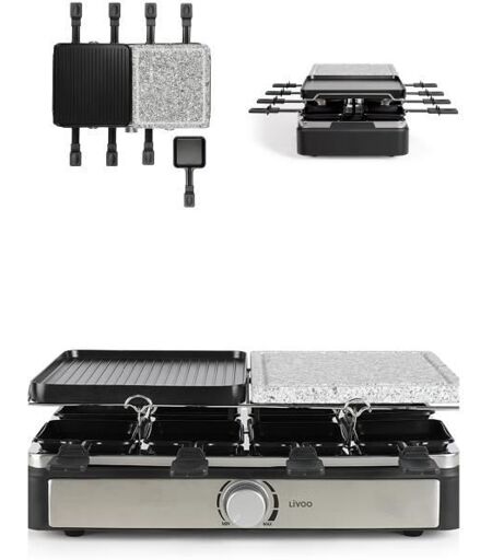 Livoo Appareil Raclette-Grill-Plancha-Pierre de Cuisson Chrome 1400 W Inclus 8 poêlons Noire Argent