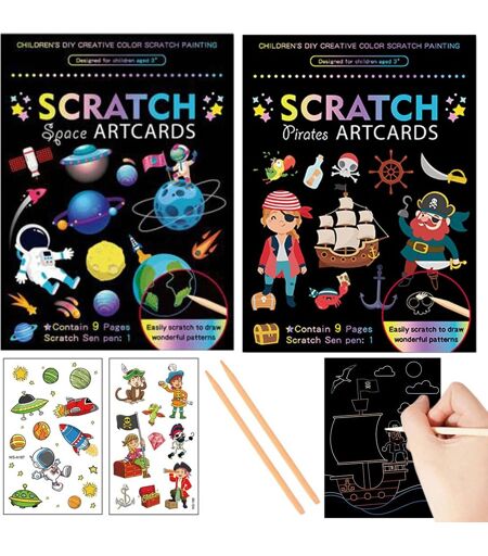 KALANKA-Scratch Art kit pour Enfants Magic Rainbow Papier à gratter Carnet de Pâques Cadeau d'anniversaire pour garçons et Filles (Pirate + Espace)