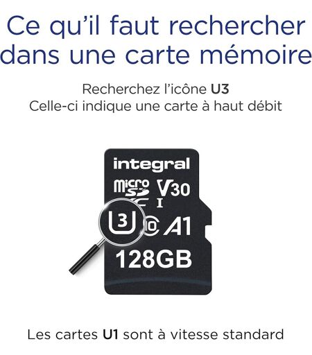 Performance Fiable \u2013 Plus de 50 millions de cartes mémoire Integral vendues dans le monde Optimisé pour la Vidéo 4K \u2013 Certification UHS-I, U3, V30 Classe 10 pour un enregistrement fluide en 4K UHD et Full HD Pack double cartes mémoire premium haute vitesse \u2013 jusqu'à 100MB/s en lecture et 50MB/s en écriture pour un transfert rapide et des performances fluides. Conçu pour les Applications \u2013 Certification A1 pour une exécution fluide des applications et une gestion efficace des fichiers Compatibilité Polyvalente \u2013 Fonctionne avec divers appareils, y compris smartphones, tablettes, drones, caméras d'action et consoles de jeux.La livraison depuis la France est prévue dans 5 jours ouvrés, n'hésitez pas à passer votre commande ...