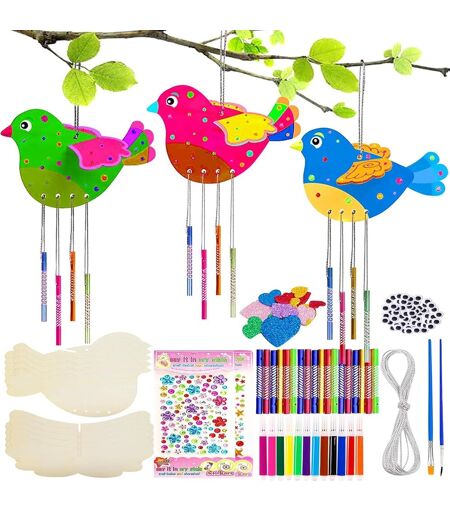 KALANKA-Kits Bricolage Oiseaux 3D Carillon à Vent, 8 Pcs Artisanat en Bois à Peindre, DIY Activité Manuelle Décoration Suspendue, Loisirs Créatifs pour Enfants Garçons Filles Cadeau Anniversaire Fête