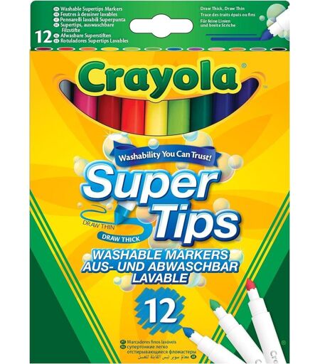 CRAYOLA SUPERTIPS : feutres à pointe moyenne en fibre DOUBLE TRAIT D\u2019ÉCRITURE : fin ou épais en fonction de l'inclinaison du feutre 12 COULEURS : des couleurs assorties brillantes et vives pour laisser libre cours à l\u2019imagination LIBÈRE TA CRÉATIVITÉ : pour colorier, dessiner, réaliser des lettrages, calligraphie et écriture manuscrite Pour l'école et les loisirs COULEURS LAVABLES : des couleurs brillantes et vives qui s'enlèvent facilement des mains et de la plupart des vêtements Attention:Ne convient pas aux enfants de moins de 36 mois.La livraison depuis la France est prévue dans 5 jours ouvrés, n'hésitez pas à passer votre commande ...