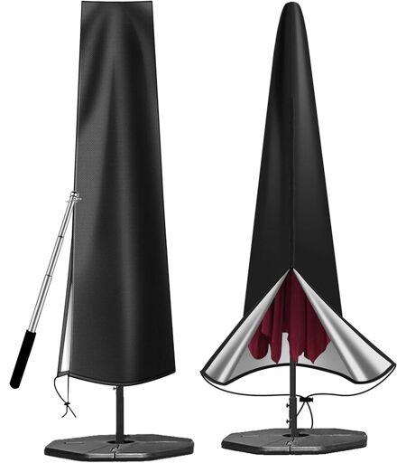 TAILLE DU PARASOL HOUSSE - 190 cm de haut x 30 cm de large (en haut) / 50 cm de large (en bas). Convient pour un parapluie de 2 ¿¿ 3 m de diam¿¿tre.TISSU R¿¿SISTANT ¿¿ L'EAU - Le tissu Oxford 600d durable garde votre parapluie au sec et comme neuf les jours de pluie et de soleil. La housse de parasol a un rev¿ºtement PVC ¿¿ l'int¿¿rieur et un rev¿ºtement PU sur la surface, l'eau glissera le long de la surface de la housse.CONCEPTION COUPE-VENT - Un cordon de serrage r¿¿glable en bas l'emp¿ºche d'¿ºtre emport¿¿ par des vents forts. Equip¿¿ d'un long zip du centre vers le bas, il est plus facile de ranger les housses pour parasols de jardin.R¿¿SISTANT AUX D¿¿CHIRURES - Le bache parasol est fabriqu¿¿ en tissu Oxford 600d, r¿¿sistant aux intemp¿¿ries et ¿¿ la lumi¿¿re du soleil.FACILE ¿¿ NETTOYER - Vous pouvez rincer avec un pistolet ¿¿ tuyau ou essuyer avec un chiffon humide et le s¿¿cher au soleil pour votre prochaine utilisation. Comprend un ¿¿tui de transport ¿¿ fermeture ¿¿clair pour vous aider ¿¿ organ r votre parasol prot¿¿g¿¿. ...