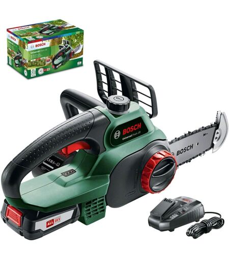 Bosch CHECARZHN--NO1-Home And Garden Tronçonneuse Sans Fil - Universal Chain 18 (Livrée Avec 1 Batterie 18V - 2,5Ah, Huile 80 Ml, Système 18V, Longueur De Guide 20Cm) Vert