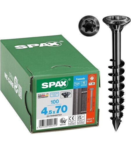 Spax CHECARZHN--NO1-25170404507021 Lot De 100 Vis De Façade, 4,5 X 70 Mm, Filetage Partiel, Tête Fraisée Bombée, T-Star Plus T20, Pointe Cut, En Acier Inoxydable A2 Blax
