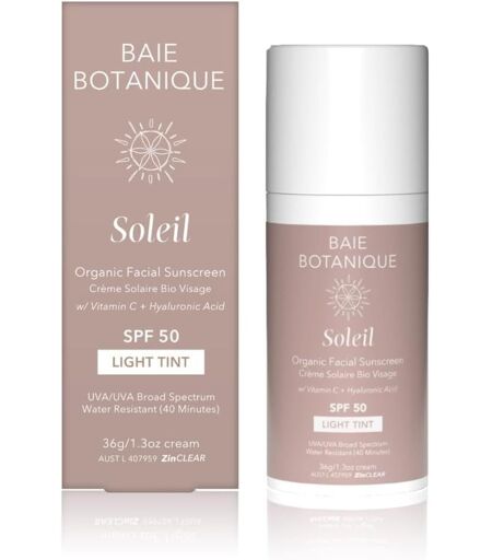 UNE CRÈME SOLAIRE SANS TRACE BLANCHE Baie Botanique Soleil est une crème solaire à l'oxyde de zinc pour le vi qui se fond parfaitement dans la peau et ne laisse pas de traces blanches. Elle offre une protection à large spectre en bloquant les rayons UV nocifs pour votre vi , vous laissant avec un éclat sain.FILTRE SOLAIRE NON-NANO À L'OXYDE DE ZINC Cette formule d'écran solaire hydratant pour le vi et le corps, d'origine biologique et végétalienne, contient un filtre solaire à large spectre non nano à l'oxyde de zinc non enrobé. Cet oxyde de zinc naturel SPF50 protège la peau des rayons UVA/UVB nocifs. L'huile de tournesol aide à apa r, renforcer et nourrir la peau.REGIME NATUREL DE SOINS DE LA PEAU Cette crème solaire biologique pour le vi SPF 50 aide à prévenir les éruptions cutanées et constitue une protection solaire essentielle pour les personnes ayant une peau sujette à l'acné. Elle s'intègre parfaitement et améliore l'apparence du teint en atténuant les irrégularités de couleur, les ridules et les rides.COUVERTURE LÉGÈRE POUR LA PEAU DU VI Ce flacon pompe de crème solaire pour le vi à la vitamine C en format voyage est idéal pour être emporté avec vous comme crème solaire quotidienne pour le vi . Elle n'obstrue pas les pores et offre une couverture légère comme base pour un maquillage naturel.PROTECTION ÉTENDUE SPF 50 Un écran solaire à l'acide hyaluronique et à la vitamine C pour les peaux sensibles du vi peut aider à guérir l'acné, la rosacée et les peaux sujettes à l'hyperpigmentation. Elle est hypoallergénique et a une teinte claire qui est si légère et rafraîchissante que vous pouvez l'util r tous les jours, et pas seulement lorsque vous allez à la plage ou que vous vous pnez à l'extérieur en hiver. ...