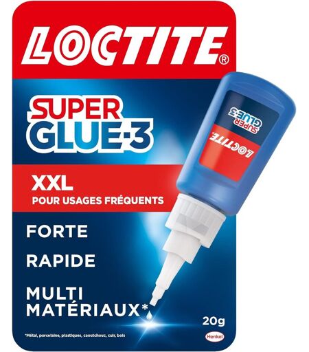Grand format ¿ Cette colle universelle grand format vous accompagnera sur toute la durée de vos travaux/collages d'envergure. C'est un outil de bricolage indispensable !Séchage instantané ¿ Grâce à la formule exceptionnelle de cette colle, les collages sont instantanés et transparents au séchage, assurant un résultat propre et efficace.Colle résistante ¿ Ne craignez plus le lave-vaisselle. Cette colle professionnelle est une colle résistante à l'eau mais aussi aux chocs et aux températures extrêmes !Tous matériaux* ¿ Cette super glue s'adapte à toutes les situations, elle est idéale pour les surfaces non poreuses et colle le bois, métal, caoutchouc, porcelaine, etc.Emballage ¿ Loctite Super Glue-3 XXL, colle cyanoacrylate, flacon de 20 g. *Sauf polyéthylène, polypropylène, polystyrène expansé, teflon, verre automobile, Styropor et fibres synthétiques.Cyanoacrylate. Danger. Colle à la peau et aux yeux en quelques secondes. À conserver hors de portée des enfants.Peut irriter les voies respiratoires.Provoque une irritation cutanée. ...