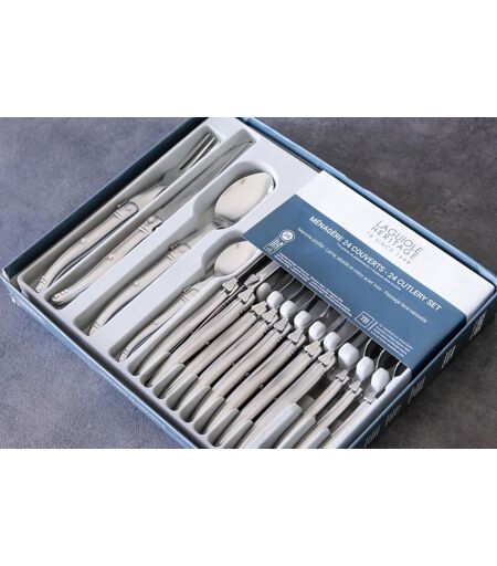 24 COUVERTS HAUT DE GAMME Ce set de 24 couverts de table aux lignes traditionnelles, simples et efficaces comprend 6 couteaux, 6 fourchettes, 6 cuillres soupe et 6 cuillres caf et permet le dressage d'une table sobre et lgante pour 6 personnes. Toute la tradition et le confort d¿un outil de qualit allis l¿lgance de la Argent .UN COFFRET CADEAU IDAL Avec leur Couleur Argent et leur solidit toute preuve, ces couverts trouveront aussi bien leur place au quotidien que pour recevoir vos invits. La mnagre se prsente sous la forme d¿un coffret rigide avec un couvercle vitrine le cadeau idal prt offrirCONUS POUR DURER, FACILES D¿ENTRETIEN Chaque pice est en acier inoxydable qui leur confre une remarquable robustesse. Trs rsistants, ces couverts de table sont conus pour une utilisation quotidienne, ils sont trs faciles d¿entretien et bnficient d¿une garantie totale lave vaisselle.UNE LIGNE INTEMPORELLE La ligne caractristique et intemporelle des couteaux de cuisine Laguiole est rinterprte dans un design lgant. Toujours marqus de l¿emblmatique abeille, ces couverts de table apportent une touche lgante et frache votre table.LA GAMME LAGUIOLE PRODUCTION C'est en conservant les codes emblmatiques de la marque l'abeille que TB Groupe a revisit le traditionnel couteau Laguiole pour crer la collection Laguiole Production. En imaginant cette gamme lgante, les ateliers TB Groupe, numro un de la coutellerie en France, ont souhait vous proposer des mnagres composes de pices de coutellerie design et ergonomiques d¿une grande qualit. ...
