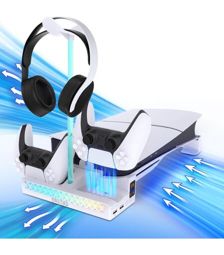 Cfux-Support Horizontal Ps5 Slim Avec Ventilateurs De Refroidissement À 2 Niveaux, Support De Base De Chargeur Manette Ps5 Et Support De Casque Pour Console Ps5 Slim Digital/Disc Console