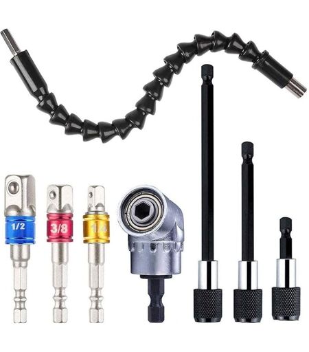 Inculde 4 différents outils les plus utiles, utilisés dans l'installation de tournevis pneumatique, tournevis électrique, perceuse pneumatique, tournevis manuel et autre installation pour l'outil hexagonal Extension d'angle de 105 degrés que vous pouvez utiliser dans les endroits où vous avez du mal à vous rendre.Grands outils pour clé et peuvent être connectés au foret.L'arbre d'entraînement hexagonal de 1/4 pouce est à changement rapide et s'adapte à la plupart des perceuses électriques et des chuacks de pilote. L'ensemble de barres d'extension de tournevis à embout hexagonal 3 pièces est conçu pour répondre à une variété de besoins. S'adapte parfaitement et en toute sécurité dans votre mandrin de perçage ou votre tournevis à main. Composé de vos tailles de mèches les plus courantes 1/4 "", 3/8"" et 1/2 ""changeant les tailles de tige. Fournit polyvalence et commodité quel que soit l'outil que vous choisissez d'utiliser. porte-forets-1/4 pouces tige hexagonale, adaptateur de mandrin d'extension magnétique, 60 mm / 100 mm / 150 mm de longueur, adapté aux tournevis électriques, pneumatiques et autres embouts de tournevis d'outils électriques, perceuse étendue. Branchez les douilles à chocs / clés à douille / douilles à embouts / douilles de conducteur à l'alimentation sans fil.Matériau :est CR-V (acier au chrome vanadium). Extension de foret d'arbre flexible - Longueur: 29 cm / 11,42 ""(environ); queue hexagonale: 6,35 mm (1/4""); Tête hexagonale intérieure: 6,35 mm (1/4 ""); Caractéristiques: pour perceuse électronique, lien de connexion, flexible Adaptateur pour douille de visseuse? Poids : noir 95 g / argent 95 g. Spécifications : 1/2"" (12,7 mm), 3/8"" (9,5 mm), 1/4"" (6,35 mm). Diamètre de la tige : Poignée hexagonale de 6,35 mm, double rainure en D. Extension de foret hexagonal 1/4? Longueur : 60 mm, 100 mm, 150 mm. Poids : 60 mm (25 g), 100 mm (32 g), 150 mm (40 g). Caractéristiques : L'interface a un mécanisme de verrouillage et un aimant puissant intégré. Convient pour le transfert de perceuses électriques, de visseuses et de visseuses pneumatiques, et élargit la conversion de différentes têtes d'embouts et de vissage. Le diamètre de la tige hexagonale est de 1/4"" (6,35 mm). L'hexagone interne a un fort magnétisme. Douille universelle 7-19 mm? Poids : 150 g. Utilisation : 7-19 mm - Convient pour toutes les formes triangulaires, carrées, hexagonales, Torx - Écrous papillons, vis de serrage et anneaux métalliques ainsi que tous les autres écrous multipans. Embout de visseuse d'angle 105°? Poids : Longueur : 158 g / court : 96 g. Caractéristiques : La poignée de raccord rapide est adaptée à toutes les perceuses électriques et les clés à douille. La tête de fonction est équipée de dispositifs de verrouillage et magnétiques qui empêchent la base de tomber. Se branche sur des embouts hexagonaux standard 1/4. Rotation à 360 degrés, rotation à 180 degrés? Convient pour les petites clés / perceuses manuelles à vitesse réglable / petites... ...