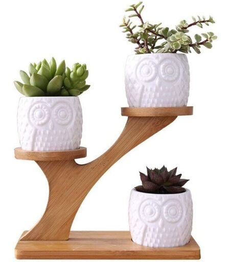 Ineasicer 1 Ensemble de chouette en céramique Pots de Fleur de Forme Rond /et Plateau de Bambou/Pots de Cactus/Plante en Pot/Cultiver 1 Paquet de 3