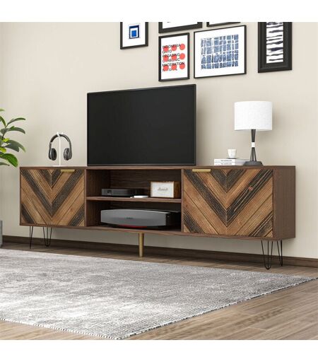 Fortuna Lai - Meuble tv 155x38x47cm - Armoire tv à 2 portes en placage de bois massif avec 2 compartiments poignées dorées et pieds en fer - marron