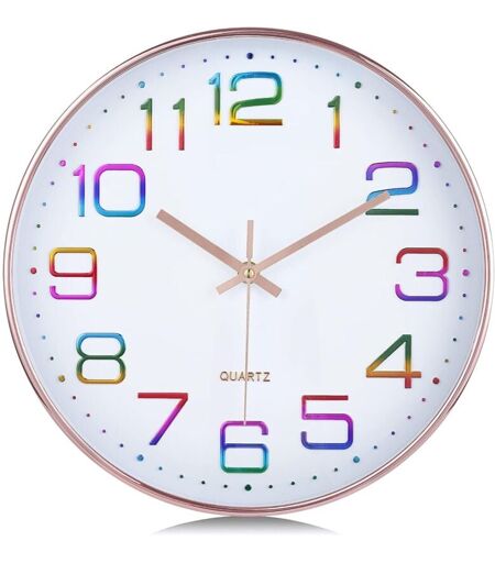 Design Créatif avec Chiffres 3D Colorés: Cette horloge murale présente un design unique et créatif. Le cadre en or rose, les chiffres 3D colorés et les aiguilles en métal font de cette horloge une décoration murale attrayante. Facile à Lire: Adoptant de grands chiffres en relief intégralement moulés, cette horloge murale de haute qualité est en bonne performance. Les chiffres colorés stéréoscopiques 3D accrocheurs sur le cadran blanc facilitent la vérification de l'heure. Mouvement Silencieux: Mouvement de mécanisme silencieux de haute qualité, vous offrant un environnement calme sans tic-tac. Cela ne peut pas affecter votre sommeil et votre travail dans la chambre ou la salle d'étude. Heure Exacte: Après avoir fonctionné par 1 pile AA, le mouvement à quartz précis garantit une heure précise. Grandes Applications: 30cm de diamètre, c'est une décoration pratique pour la chambre à coucher, le salon, la cuisine, le bureau. L'horloge murale est joliment emballée et vous pouvez l'offrir à ...