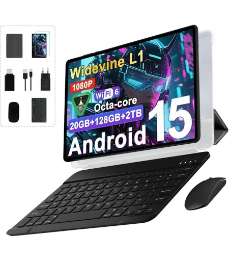 Tablette Android 15 Tablette 10 Pouces 20Go Ram+128Go Rom(2To Extensible),Octa-Core,Gms Tablette Tactile,Wifi 6,5G Wi-Fi,Widevine L1,6000Mah,Gps,Tablettes Avec Clavier+Souris Et Cas-Noir