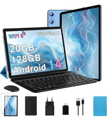 Tablette 10 Pouces Android Tablettes 20Go Ram+128Go Rom(Tf Extensible 2To),Octa-Core,Gms Tablette Tactile,Widevine L1,Wifi 6,5G+2.4G Wi-Fi,Tablettes Avec Clavier+Souris Et Cas-Bleu